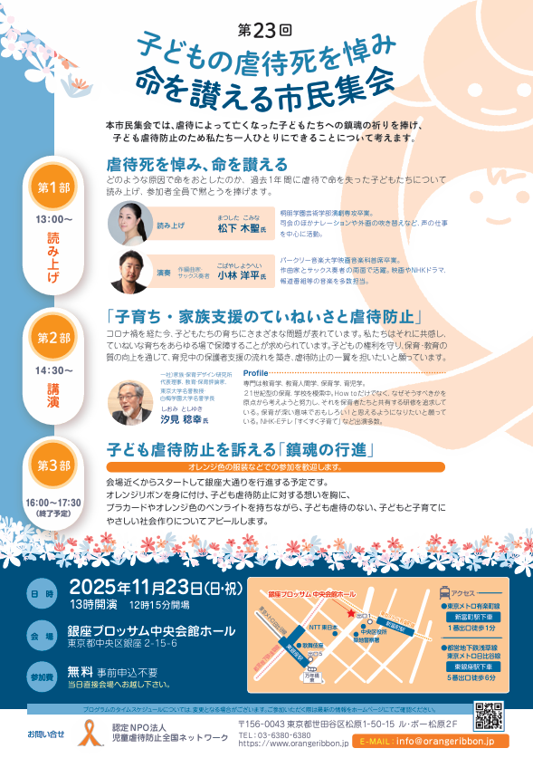 11/23 第23回子どもの虐待死を悼み命を讃える市民集会」開催のお知らせ